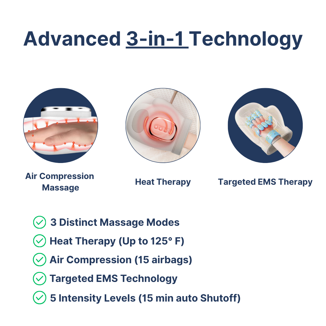 Targeted EMS and compression relieve pain at the base of the thumb, reduce inflammation, and restore grip strength for easier daily tasks.